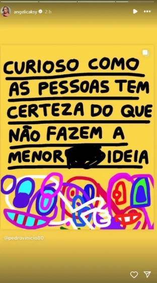 “Curioso como as pessoas têm certeza do que não fazem a menor ideia”, diz a mensagem compartilhada por Angélica. A publicação aconteceu após Duda Guerra confirmar que não fala mais com Benício após o término.