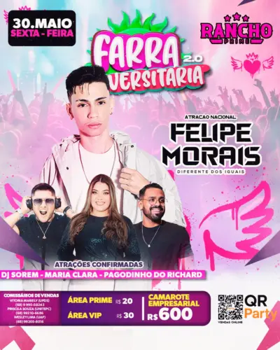 No próximo dia 30 de maio, a casa noturna Rancho Prime, referência em entretenimento na região do Alto Acre, será palco de um dos eventos mais aguardados do semestre: a Farra Universitário 2.0. A festa reúne um line-up de peso e promete uma noite de celebração vibrante, com música de qualidade e uma estrutura pensada para proporcionar uma experiência única ao público universitário e amantes da boa música.