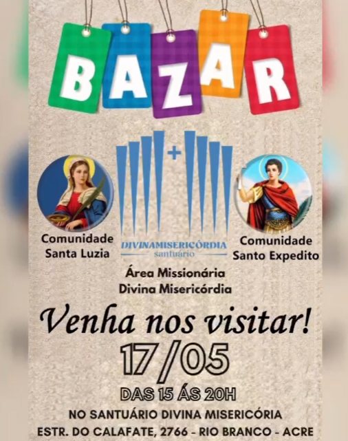 A 2ª edição do Bazar do Santuário Divina Misericórdia será realizada neste sábado (17), das 15h às 20h, na sede da igreja, localizada na Estrada do Calafate, nº 2766, em Rio Branco.