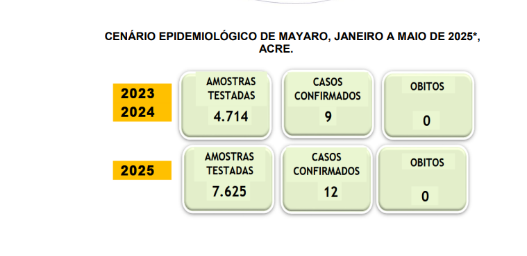 Os dados são da última edição do Boletim Epidemiológico da Secretária de Estado de Saúde (Sesacre). A febre de Mayaro é uma doença viral transmitida principalmente por mosquitos silvestres do gênero Haemagogus, comuns em áreas de floresta. Os sintomas incluem febre, dores intensas nas articulações, cefaleia, erupções na pele e fadiga. É parecida com a chikungunya e a dengue, mas ainda é considerada uma arbovirose rara no Brasil.