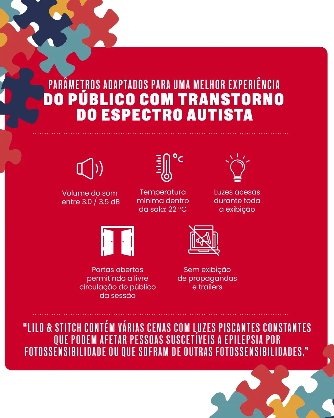 Volume de som será ajustado entre 3.0 e 3.5 decibéis, a Iluminação da sala permanecerá acesa durante toda a sessão e a temperatura será controlada em 22 °C. Alem disso as ficarão abertas, permitindo livre circulação e não haverá trailers ou propagandas antes do início do filme.