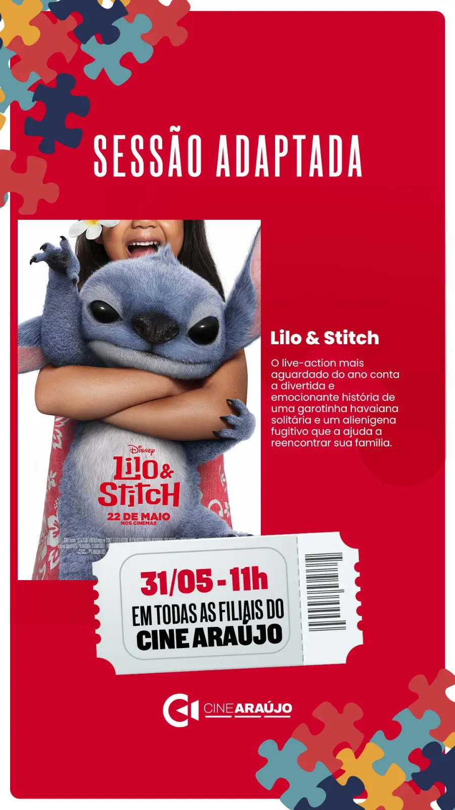 No dia 31 de maio, às 11h, o Cine Araújo realizará uma sessão adaptada do filme “Lilo & Stitch” em todas as suas unidades, como parte de uma iniciativa voltada à inclusão e ao bem-estar de pessoas com Transtorno do Espectro Autista (TEA) e outras condições sensoriais.