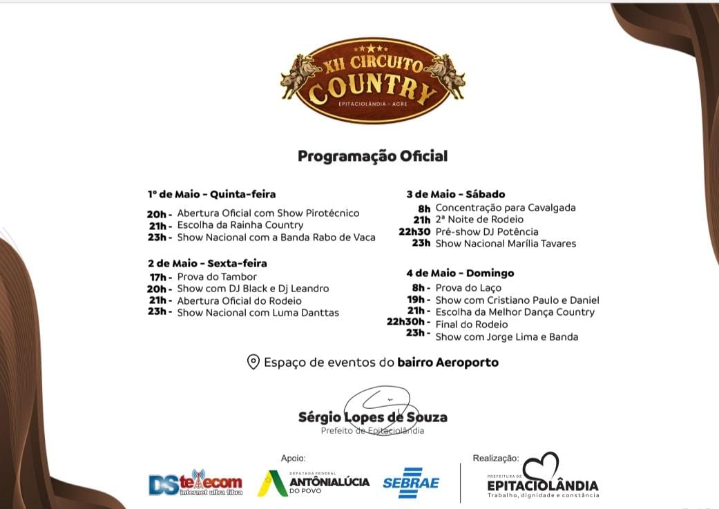 A programação do XII Circuito Country e Feira de Agronegócios de Epitaciolândia iniciou na quinta-feira (1º) e segue até domingo (4), contando com entrada solidária. Para garantir acesso aos shows, o público deve trocar alimentos não perecíveis por pulseiras na praça da Escola Joana Ribeiro Mamede, entre hoje até amanhã às 23h.