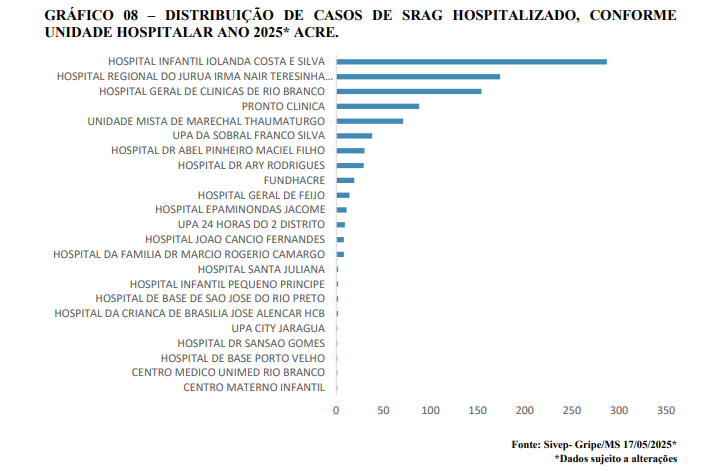 As unidades hospitalares que mais registraram internações por SRAG, em 2025, no estado, foram o Hospital Infantil Iolanda Costa e Silva, o Hospital de Urgência e Emergência de Rio Branco (HUERB) e o Hospital Regional do Juruá.