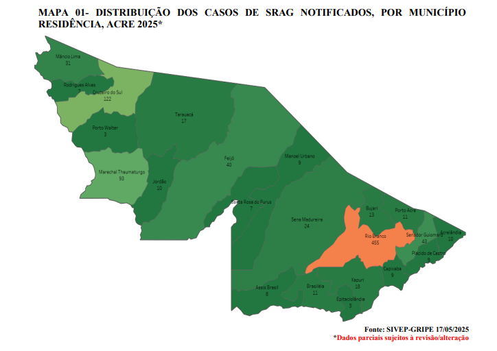 O estado do Acre registrou, entre as semanas epidemiológicas 1 a 20 de 2025, um total de 953 internações por Síndrome Respiratória Aguda Grave (SRAG), segundo dados do Boletim Epidemiológico de nº 20, da Secretaria de Estado de Saúde (Sesacre).