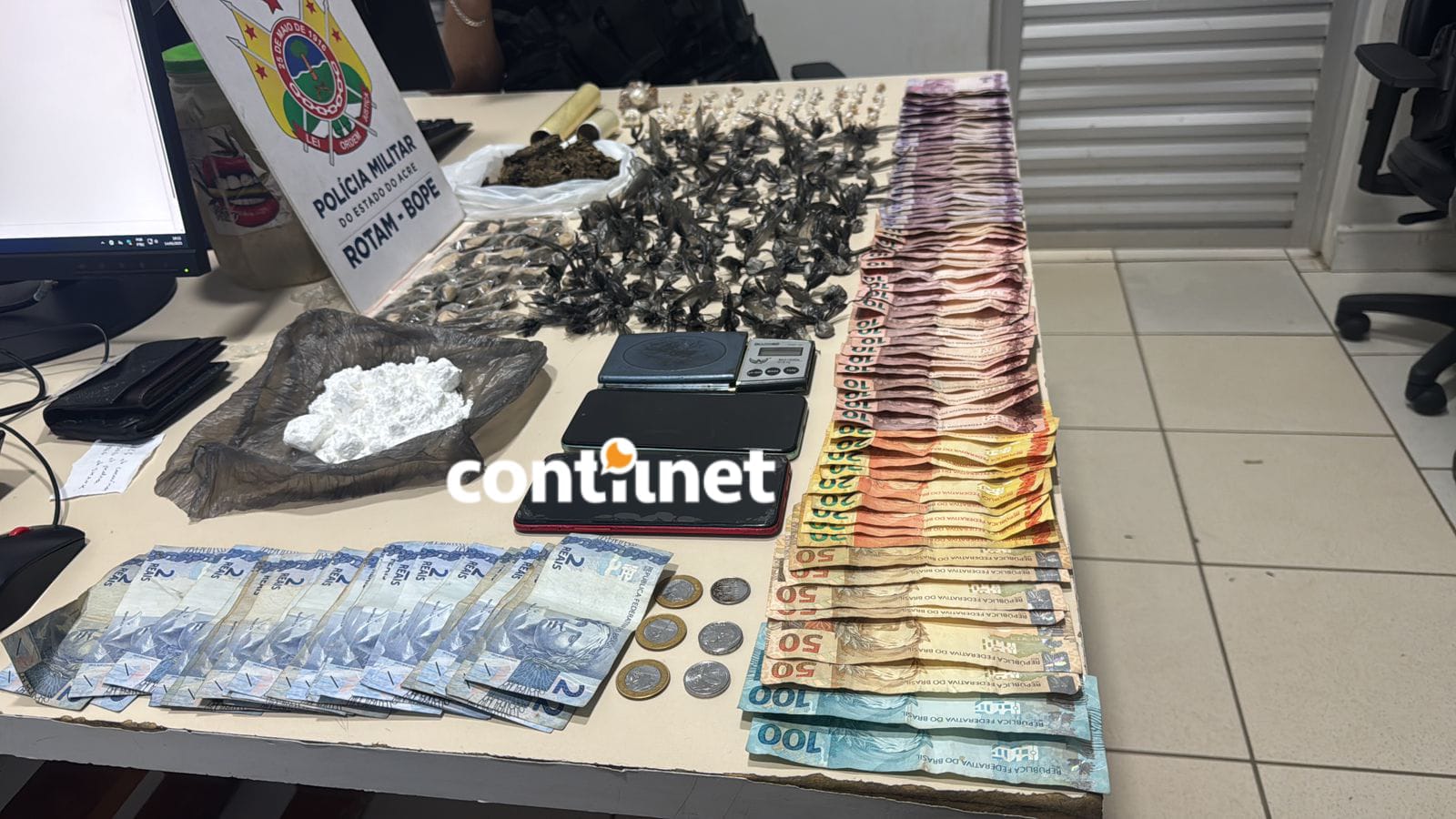Com os acusados, foram apreendidas 24 trouxinhas de maconha e mais 190 gramas da droga, 88 pedras de crack e 5 pedras maiores (totalizando 80 g), 102 trouxinhas de cocaína e um saco maior da substância (totalizando 160 g), além de uma balança de precisão, material para embalo e R$ 1.100,00 em dinheiro, proveniente da venda dos entorpecentes.