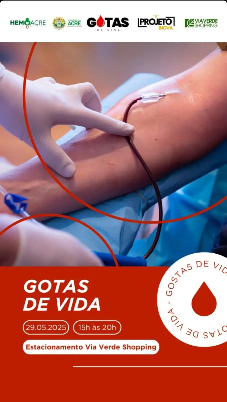 Com foco na solidariedade e no cuidado com o próximo, o Via Verde Shopping recebe nesta quinta-feira, 29 de maio, a campanha de doação de sangue “Gotas de Vida”, das 15h às 20h. A ação é organizada em parceria com o Hemoacre e conta com a mobilização dos estudantes do segundo período de Enfermagem da Uninorte, por meio do projeto educacional INOVA Nurse, idealizado pelo professor Celso Ritter.