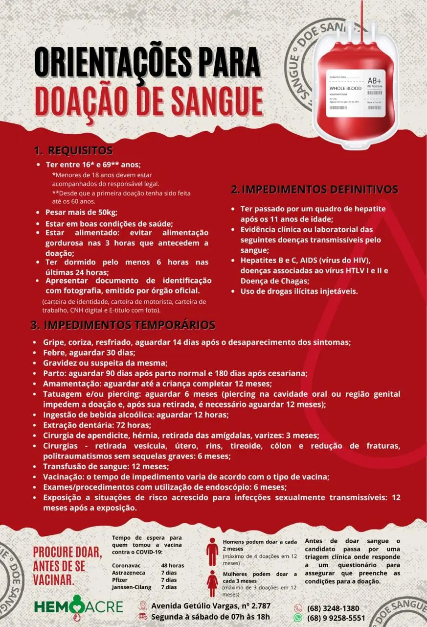 Sintomas gripais, febre, gravidez, amamentação recente, tatuagens e piercings recentes, consumo de álcool, doenças transmissíveis pelo sangue e uso de drogas injetáveis, entre outros critérios definidos pelo Ministério da Saúde.