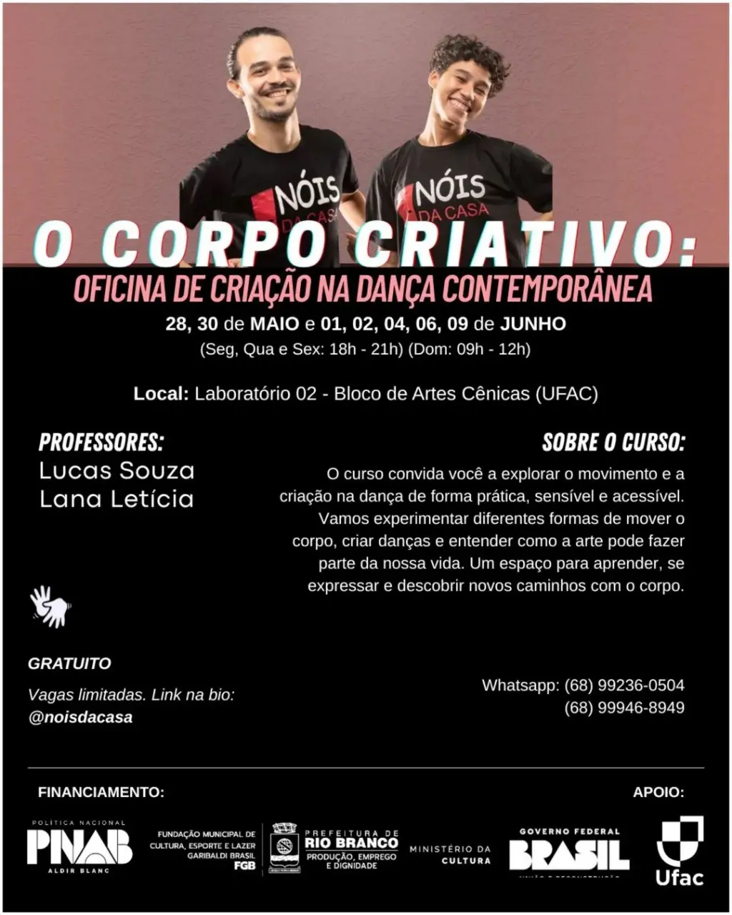 A oficina será ministrada por Lucas Souza e Lana Letícia e tem como foco a experimentação artística e o desenvolvimento da criatividade, utilizando práticas de improvisação e composição em dança.