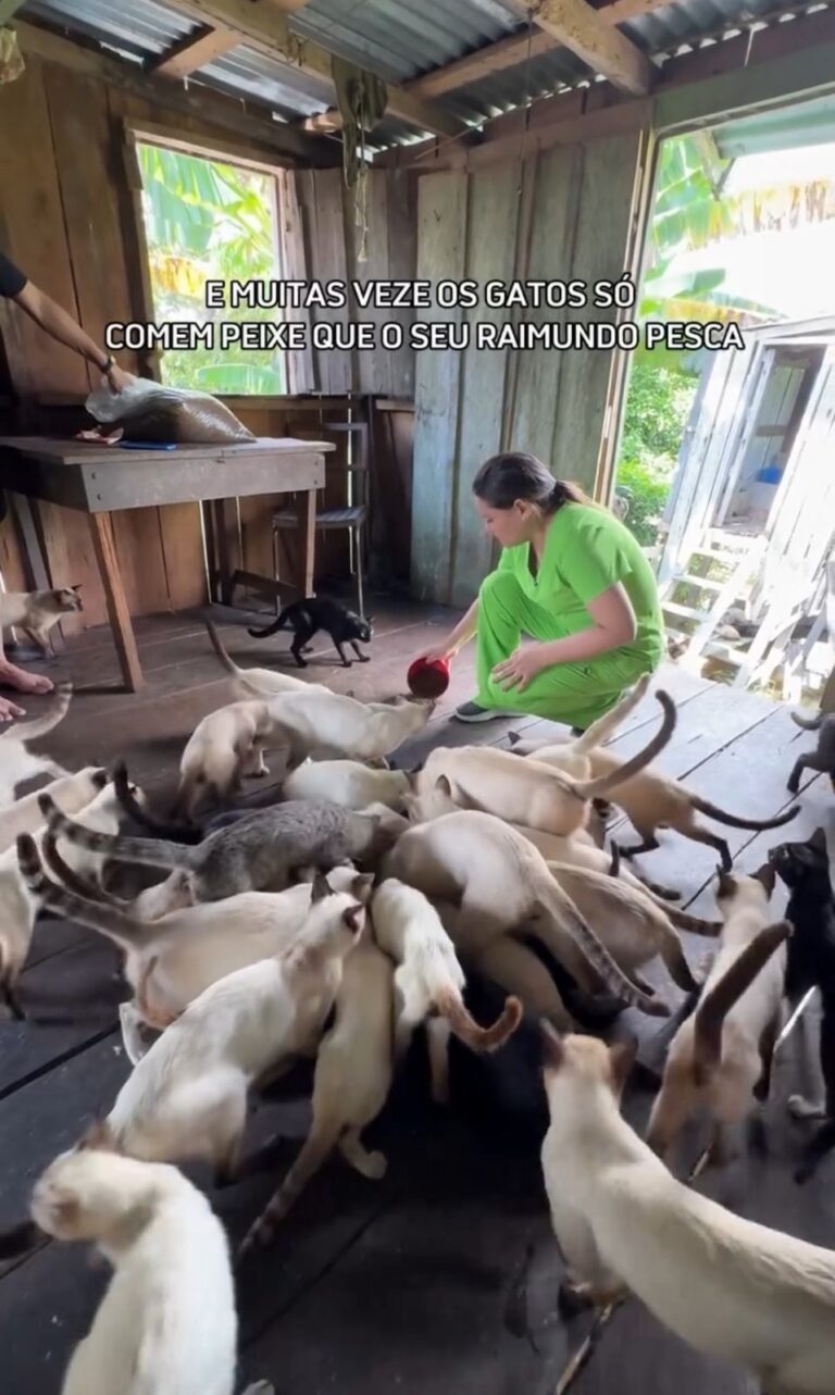 “Quando reduzimos a velocidade da lancha, vimos diversos gatinhos na varanda de uma casa e fomos conhecer de perto. Dois idosos e quase 100 gatos vivendo juntos. Eles são pessoas que amam os animais e fazem tudo ao alcance deles”, escreveu Joana Darc na legenda da publicação.