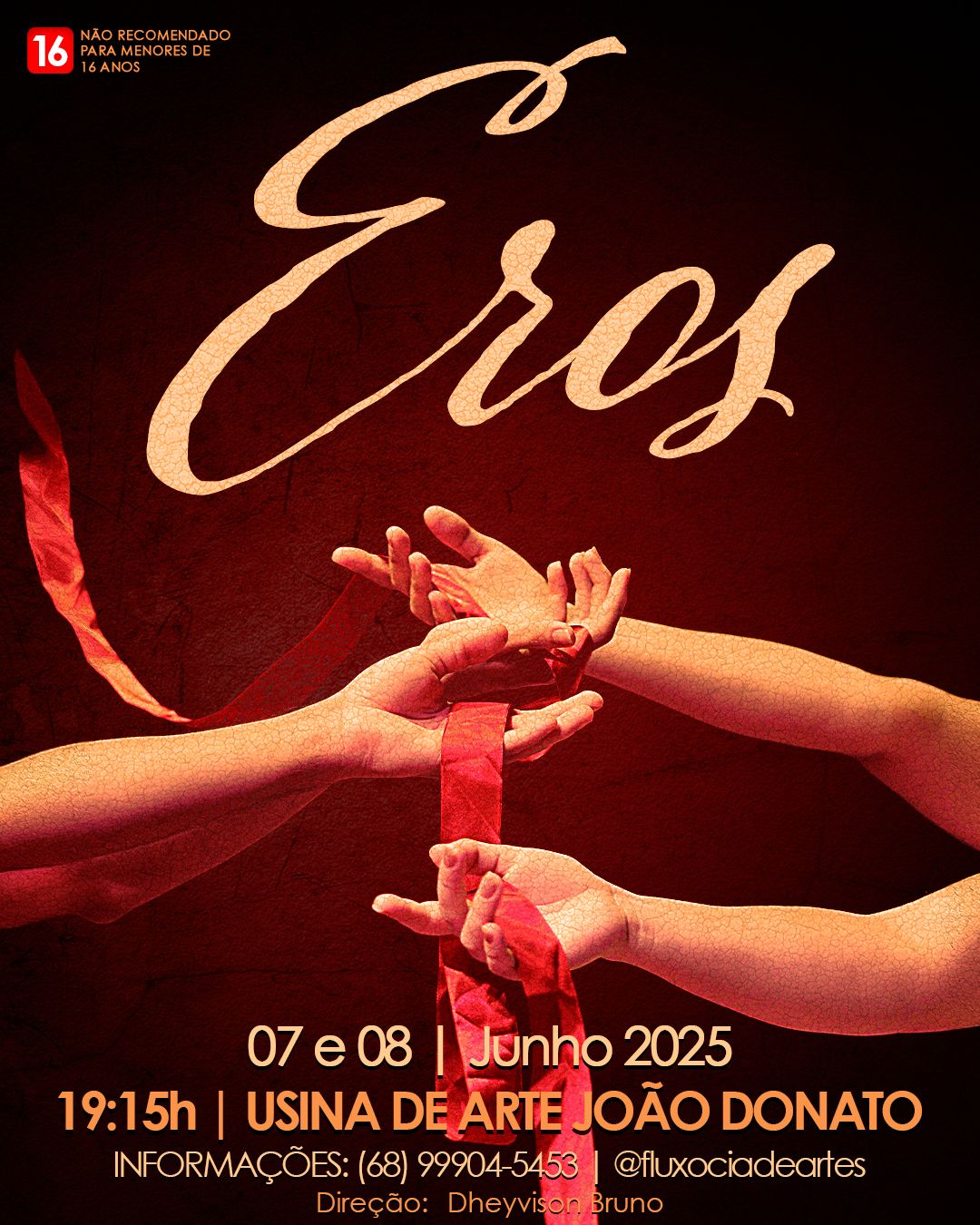 A Fluxo Cia de Artes apresenta a 3ª temporada do espetáculo Eros, que volta aos palcos nos dias 7 e 8 de junho, às 19h15, na Usina de Arte João Donato, em Rio Branco. A obra, que une dança e teatro, chega com novidades no roteiro, figurinos e trilha sonora, prometendo uma experiência ainda mais intensa e reflexiva para o público.