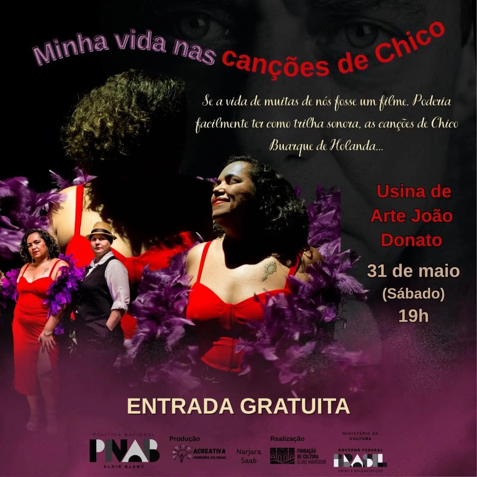 A Usina de Arte João Donato será palco, no próximo 31 de maio (sábado), do espetáculo cênico musical “Minha Vida nas Canções de Chico”, uma homenagem sensível e potente ao universo feminino a partir da obra de Chico Buarque. Com entrada gratuita, o espetáculo terá início às 19h, com distribuição de convites a partir das 18h, diretamente na bilheteria do teatro.