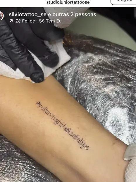 Uma fã do ex-casal Zé Felipe e Virgínia Fonseca resolveu levar a sério sua torcida pela reconciliação dos dois artistas. Em vez de se limitar a comentários nas redes sociais ou publicações emocionadas, ela decidiu eternizar seu apelo diretamente na pele. A frase escolhida – “Volta, Zé Felipe e Virgínia” – foi tatuada na canela, transformando o corpo em um verdadeiro outdoor de uma separação alheia.