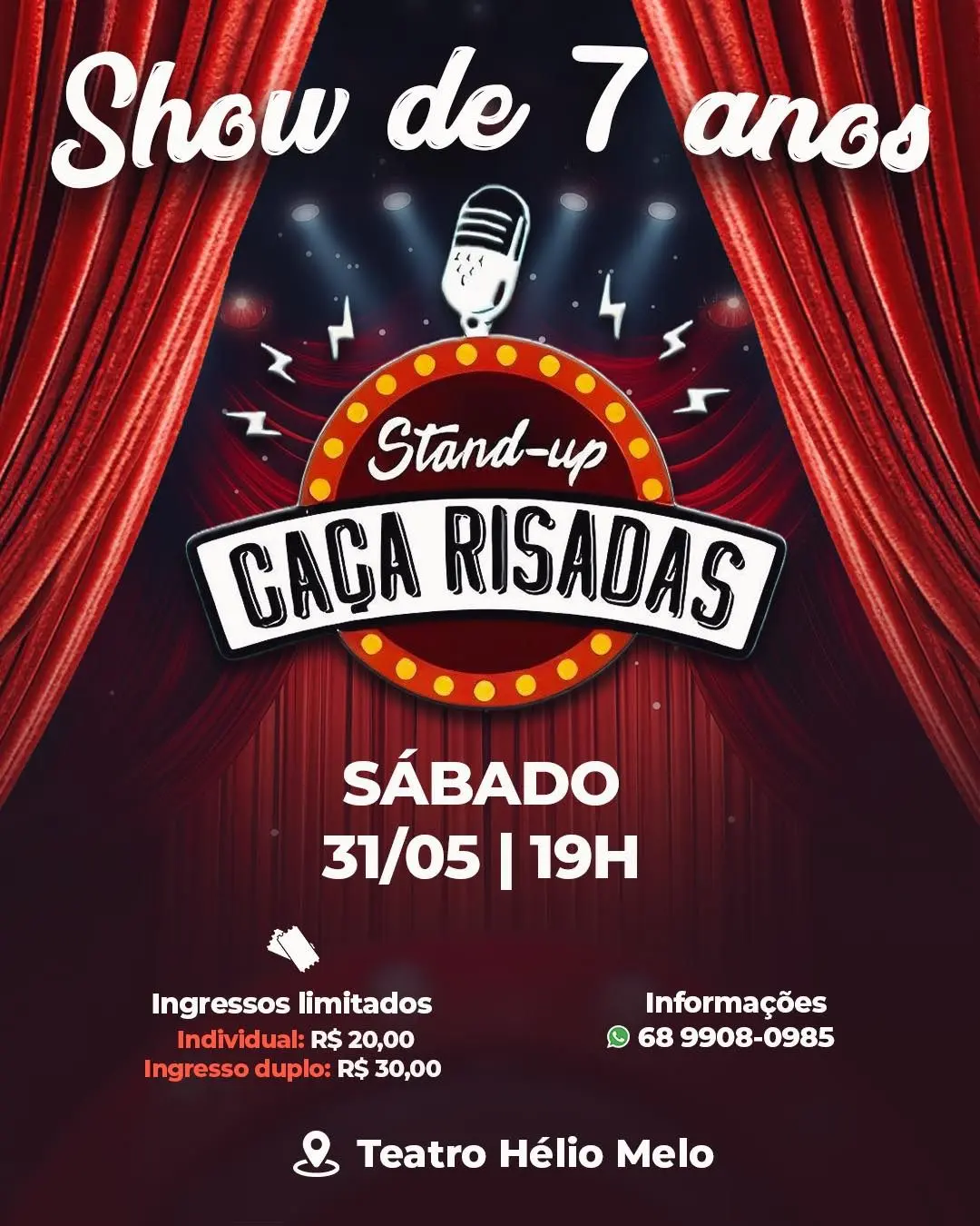 O grupo acreano de stand-up comedy Caça Risadas celebra, neste sábado (31), sete anos de trajetória levando humor para palcos do Acre e de outros estados. Para marcar a data, os comediantes realizam um show comemorativo no Teatro Hélio Melo, no Centro de Rio Branco, a partir das 19h.