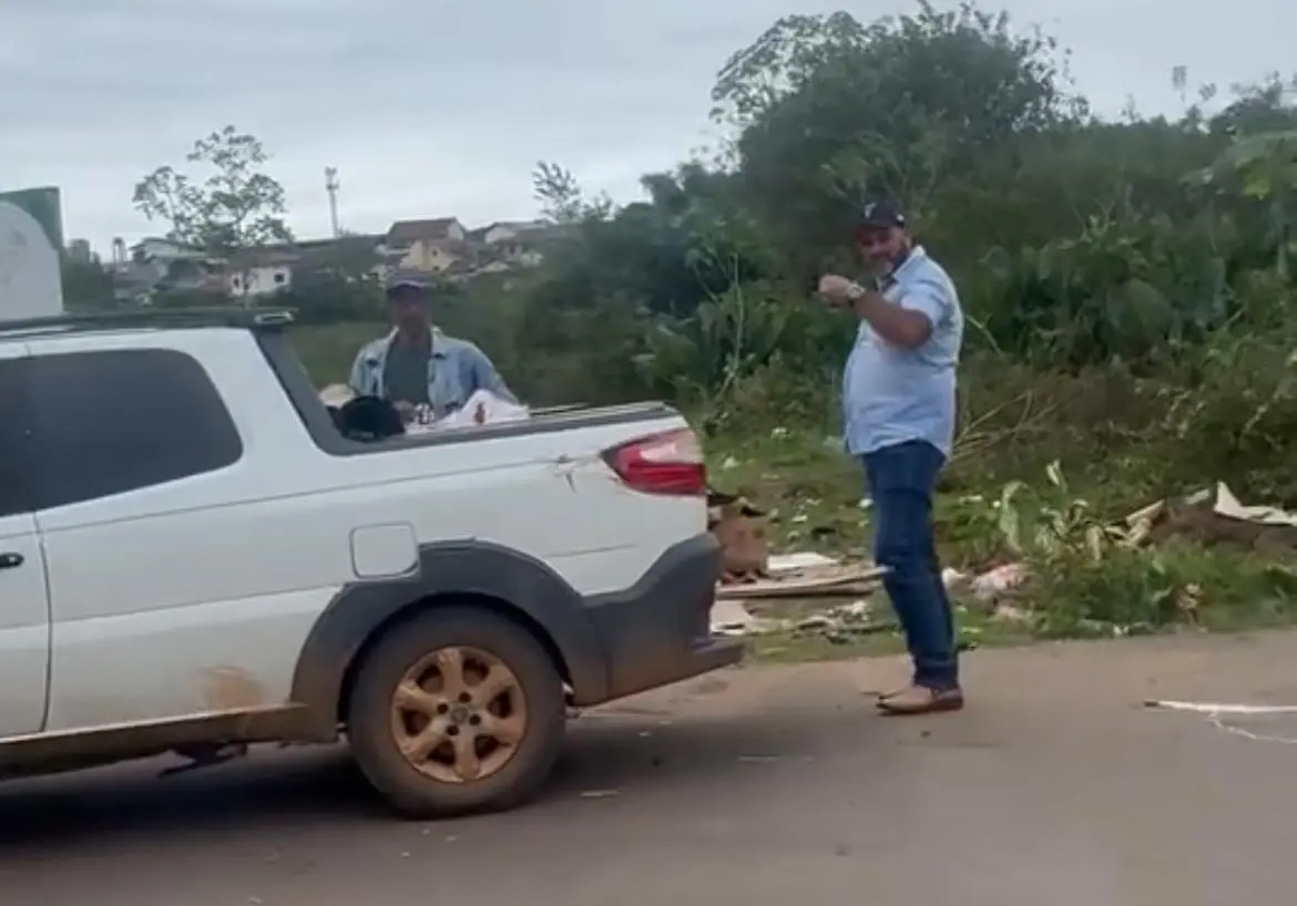 Nas imagens é possível ver os dois homens com uma picape, Fiat Strada, de cor branca, parada na rua. Um fato curioso, é que a dupla estacionou o veículo bem abaixo de uma placa grande, em que estava escrito: “Proibido jogar lixo”, ignorando o aviso.