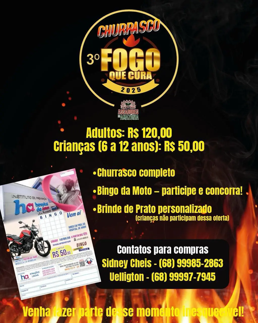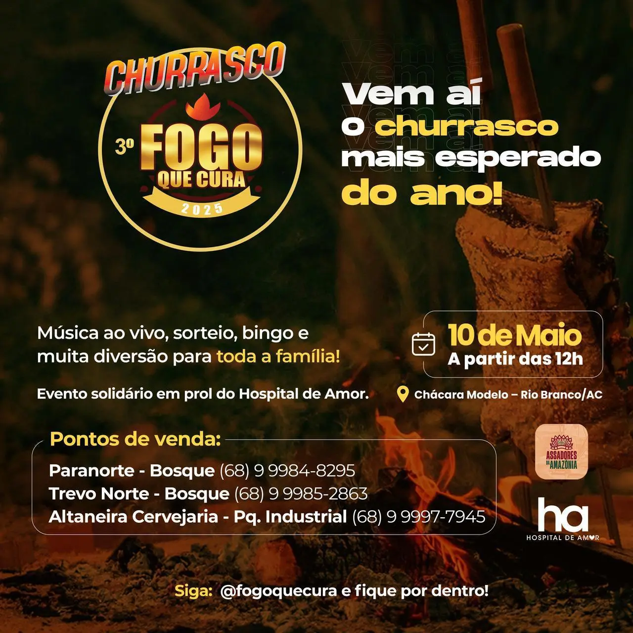 O Churrasco Fogo que Cura será realizado no próximo dia 10 de maio, a partir das 12h, na Chácara Modelo, em Rio Branco. Os ingressos podem ser adquiridos nas lojas Paranorte e trevo Norte, bem como no Parque Industrial da Altaneira Cervejaria. Mais informações por meio dos números: (68) 9 9985-2863 ou (68) 9 9997-7945.