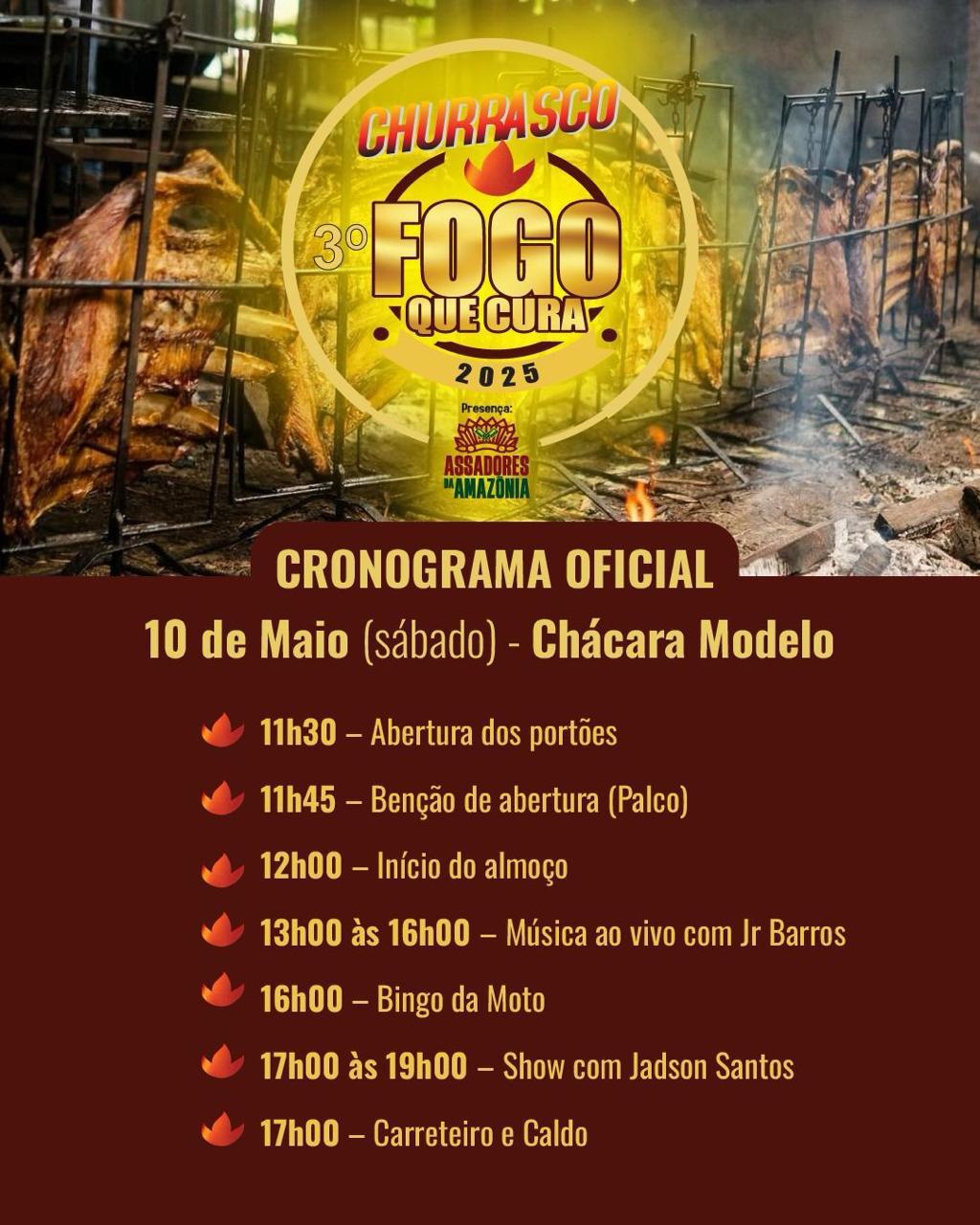 O Churrasco Fogo que Cura será realizado no próximo dia 10 de maio, a partir das 12h, na Chácara Modelo, em Rio Branco. Os ingressos podem ser adquiridos nas lojas Paranorte e trevo Norte, bem como no Parque Industrial da Altaneira Cervejaria. Mais informações por meio dos números: (68) 9 9985-2863 ou (68) 9 9997-7945.