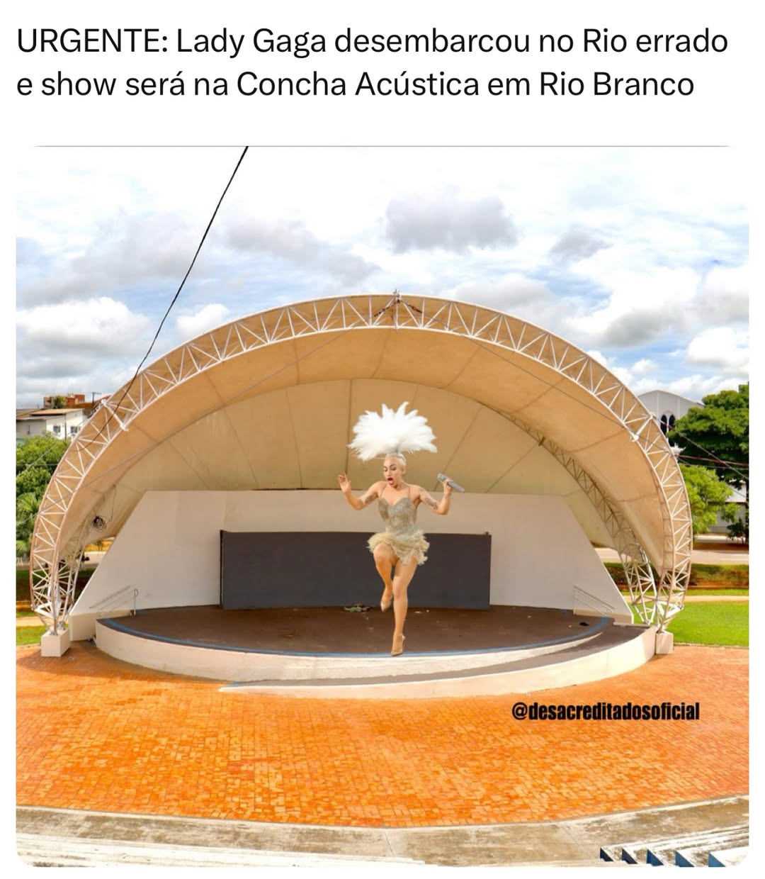 Os acreanos foram surpreendidos por uma montagem inusitada que viralizou nas redes sociais nesta quinta-feira (2). O perfil de humor “Desacreditados Oficial” publicou um meme colocando ninguém menos que Lady Gaga na Concha Acústica de Rio Branco, um dos pontos mais tradicionais da capital acreana. A imagem traz a diva pop performando como se estivesse em um grande show no coração do Parque da Maternidade.