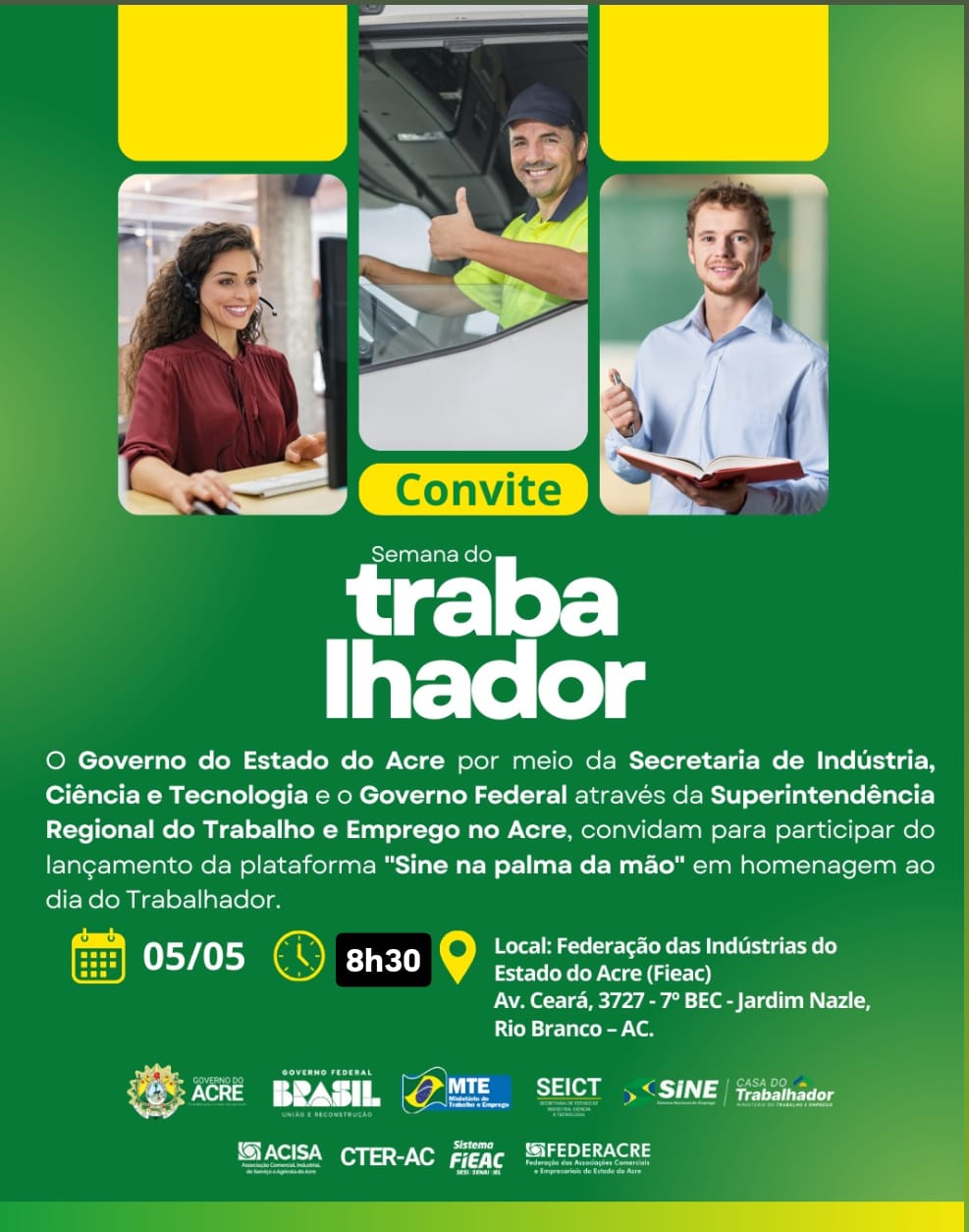 Em homenagem ao Dia do Trabalhador, o Governo do Estado do Acre, por meio da Secretaria de Indústria, Ciência e Tecnologia (Seict), e o Governo Federal, por meio da Superintendência Regional do Trabalho e Emprego no Acre, promovem neste domingo (5) o lançamento da plataforma “Sine na palma da mão”. A cerimônia será realizada a partir das 8h30, na sede da Federação das Indústrias do Estado do Acre (Fieac), localizada na Avenida Ceará, nº 3727, bairro Jardim Nazle, em Rio Branco.
