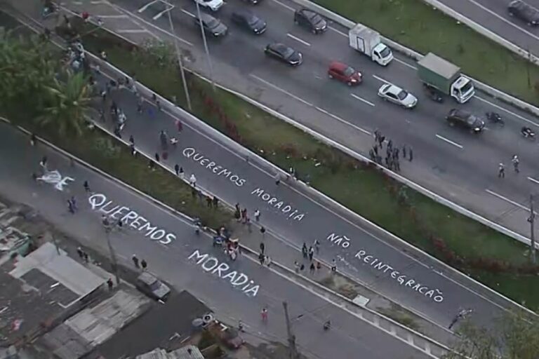Segundo a Polícia Militar, trata-se de um ato de 100 manifestantes que reivindicam melhores condições de moradia. Os protestantes escreveram na pista, com letras brancas, frases como “Queremos moradia” e “Não reintegração”.