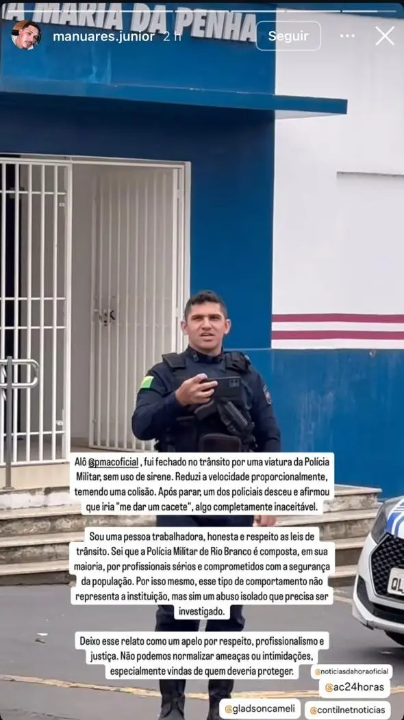 “Sou uma pessoa trabalhadora, honesta e respeito as leis de trânsito. Sei que a Polícia Militar de Rio Branco é composta, em sua maioria, por profissionais sérios e comprometidos com a segurança da população. Por isso mesmo, esse tipo de comportamento não representa a instituição, mas sim um abuso isolado que precisa ser investigado”, continuou.
