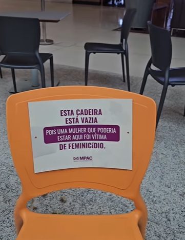 Quantos espaços estão vazios por causa da violência contra a mulher? A pergunta conduz a campanha promovida pelo Ministério Público do Estado do Acre (MPAC), em parceria com o Via Verde Shopping, que instalou cadeiras sinalizadas com a frase “Esta cadeira está vazia pois uma mulher que poderia estar aqui foi vítima de feminicídio”.