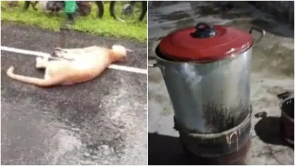Vídeos que circulam nas redes sociais mostram a onça-parda caída no chão, já sem vida. Em outras imagens, é possível ver moradores com pedaços do animal enquanto preparam o ensopado.