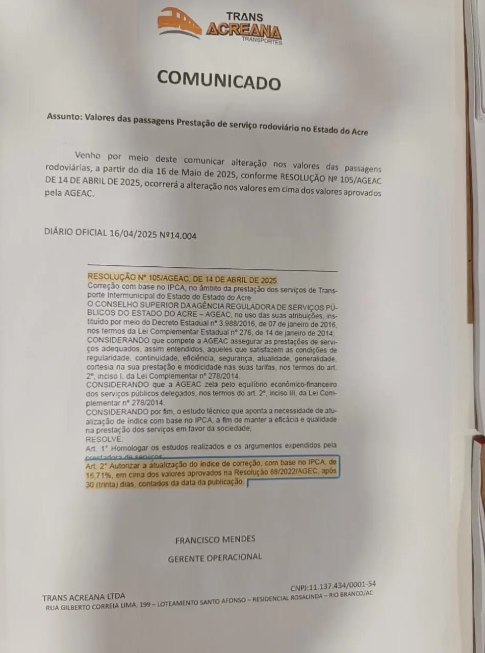 A Trans Acreana destacou, em comunicado assinado pelo gerente operacional Francisco Mendes, que os novos valores passam a valer trinta dias após a publicação da resolução, atendendo às exigências legais.