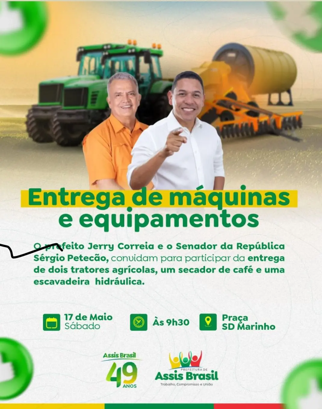 O prefeito de Assis Brasil, Jerry Correia (PP), ao lado do senador da República, Sérgio Petecão (PSD), realiza, na manhã deste sábado (17), a entrega de dois tratores agrícolas, um secador de café e uma escavadeira hidráulica.