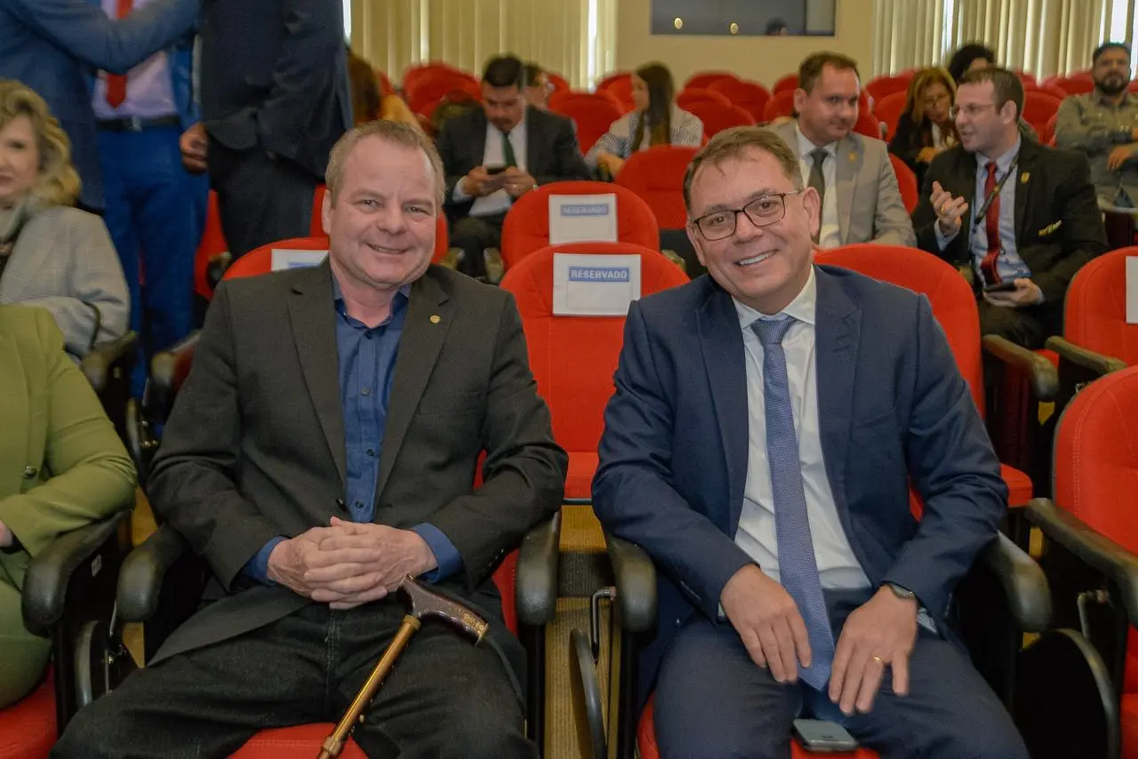 Durante o evento, o prefeito em exercício Alysson Bestene parabenizou o delegado Emylson Farias pela posse e destacou a capacidade de diálogo e articulação como qualidades essenciais para a condução da associação.