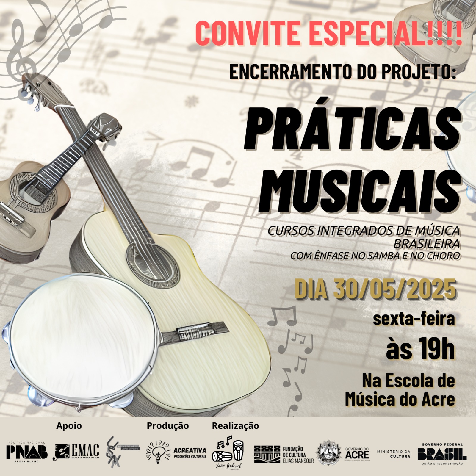 Após três meses de atividades formativas, o projeto Práticas Musicais – Cursos Integrados de Música Brasileira encerra sua primeira edição com uma apresentação cultural no dia 30 de maio, às 19h, na Escola de Música do Acre, em Rio Branco. O evento marca a culminância do processo pedagógico e contará com a participação dos alunos das turmas de violão, cavaquinho e pandeiro, além dos músicos e professores Adson Barbosa (violão), João Gabriel Brito (pandeiro) e José Luiz dos Santos Macambira (cavaquinho).