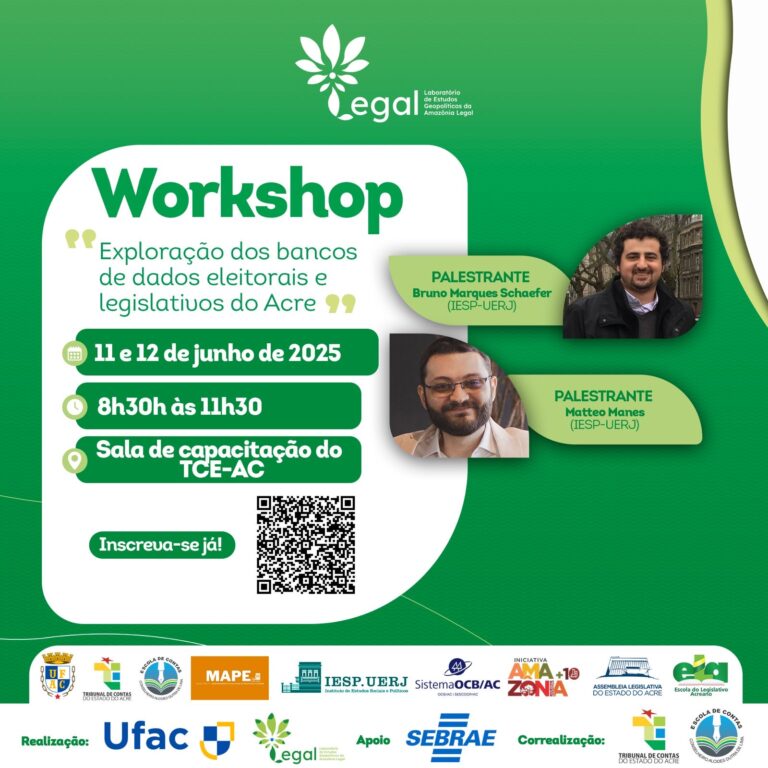 O Projeto Legal no Acre, iniciativa de pesquisa colaborativa entre a Universidade Federal do Acre (UFAC) e o Instituto de Estudos Sociais e Políticos da Universidade do Estado do Rio de Janeiro (IESP-UERJ), promove, nos dias 11 e 12 de junho de 2025, o Workshop “Exploração dos bancos de dados eleitorais e legislativos do Acre”.