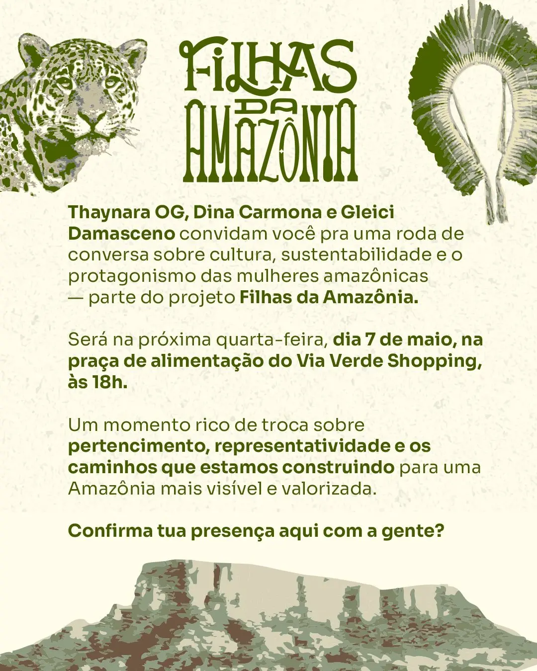 Acontece hoje, a partir das 18h, na Praça de Alimentação do Via Verde Shopping, uma inspiradora roda de conversa com Thaynara OG, Dina Carmona e Gleice Damasceno. O encontro integra o projeto Filhas da Amazônia e promete um debate enriquecedor sobre cultura, sustentabilidade e o protagonismo das mulheres da Amazônia. Uma ótima oportunidade para quem valoriza conhecimento, representatividade e conexão com as raízes da nossa floresta.