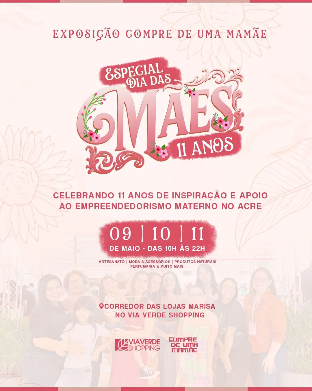 A Rede de Empreendedorismo Materno do Acre, conhecida como Compre de uma Mamãe, celebra em 2025 uma marca importante: 11 anos de atuação contínua apoiando, inspirando e fortalecendo mulheres que empreendem após a maternidade. E para comemorar essa trajetória, será realizada uma exposição especial nos dias 9, 10 e 11 de maio, das 10h às 22h, no corredor das Lojas Marisa do Via Verde Shopping.