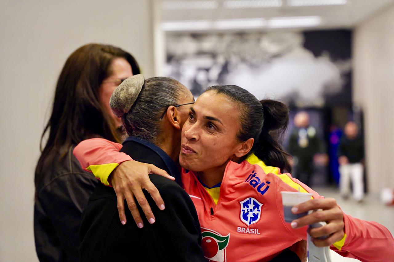 Marta e Marina Silva se encontram antes do amistoso contra o Japão. A jogadora liderou a homenagem à ministra em reconhecimento à sua trajetória e luta pelos direitos das mulheres e do meio ambiente/Foto: Reprodução