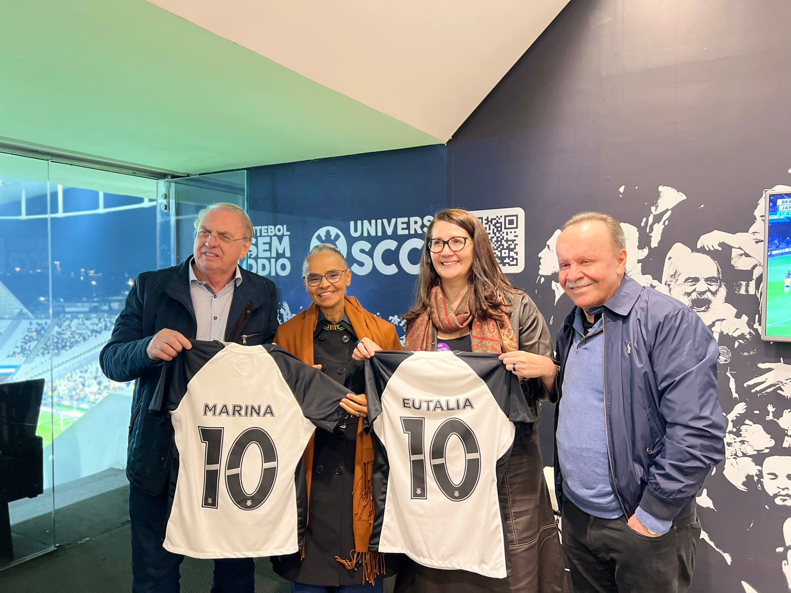 Ministra Marina Silva exibe as camisas recebidas da seleção brasileira feminina durante a homenagem na Neo Química Arena, em São Paulo/Foto: Reprodução
