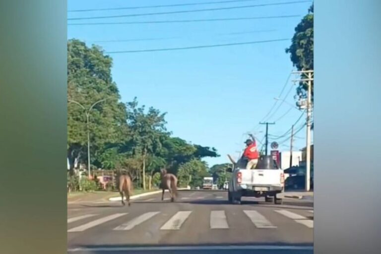 O vídeo foi compartilhado na página do Campo Grande Mil Grau e mostra o momento em que o homem, de cima de uma caminhonete em movimento, manuseia uma corda e lança contra os animais, na tentativa de capturá-los, porém, eles atravessam o canteiro central e vão para o outro lado da pista.