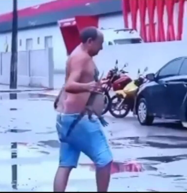 O momento foi registrado em vídeo por populares e rapidamente ganhou repercussão nas redes sociais. Nas imagens, o morador, descalço e sem camisa, se aproxima do animal com calma e segurança. Com um movimento firme, ele segura o filhote pela cabeça e o retira da via, enquanto é observado por curiosos que acompanhavam a ação à distância.