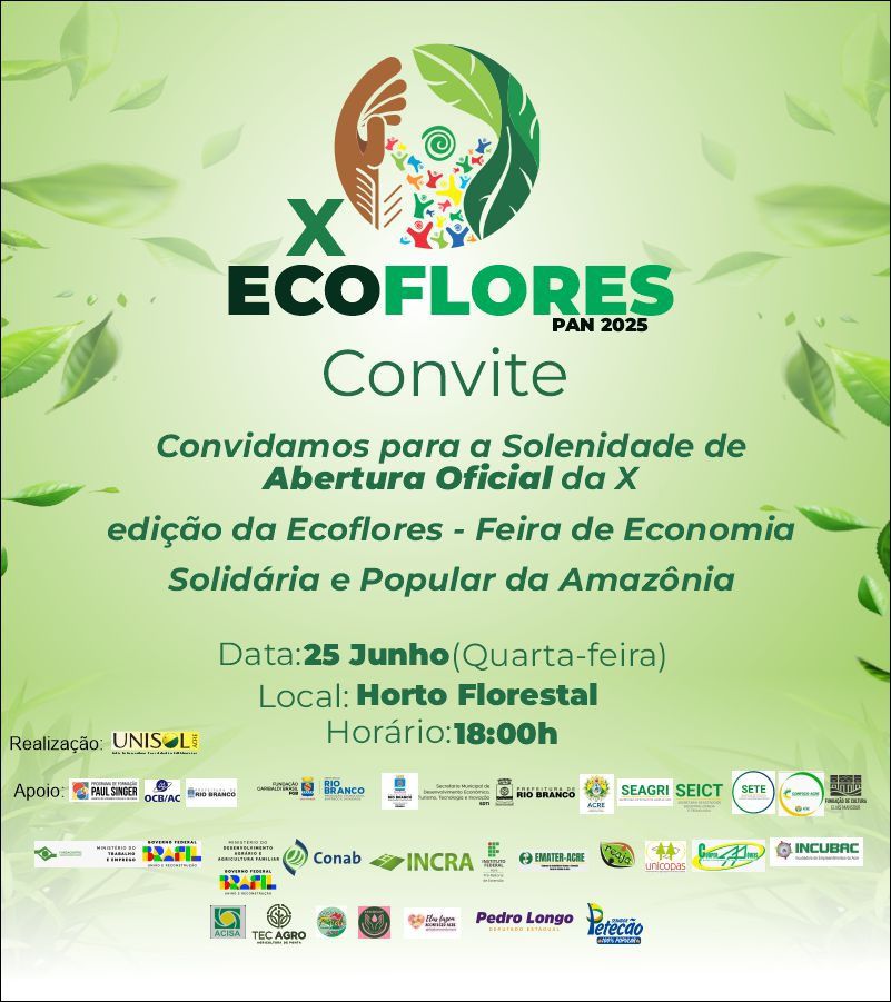 Acontece nesta quarta-feira, 25 de junho, a partir das 18h, no Horto Florestal de Rio Branco, a abertura oficial da X edição da Ecoflores – Feira de Economia Popular e Solidária, que este ano traz o tema “Educação, Comunicação e Meio Ambiente”.