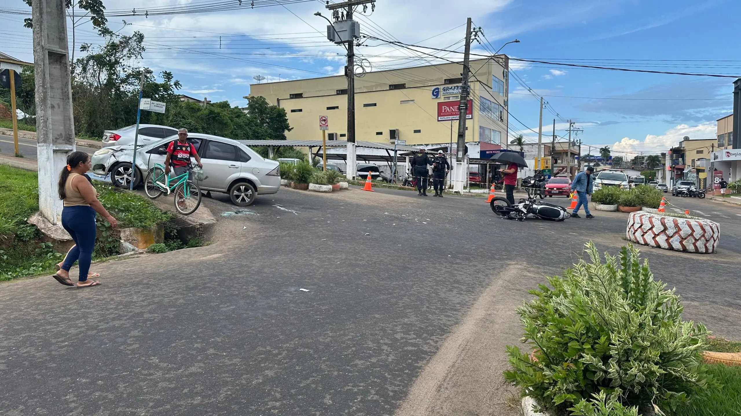Na tarde desta quinta-feira, 5 de junho, um acidente de trânsito envolvendo um carro e uma motocicleta foi registrado na rotatória da Rua 28 de Setembro, no centro de Cruzeiro do Sul. A colisão causou alvoroço entre pedestres e motoristas que passavam pelo local no momento do ocorrido.