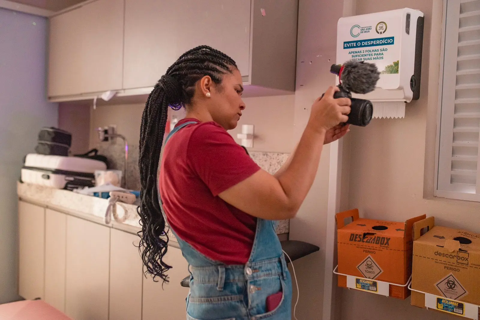 “Aí comecei a entender de assistência, porque, assim, eu estava do lado da mulher que é assistida, e fotografando ainda com a cabeça da mulher que era assistida. Quando entrei nos hospitais — porque até então só tinha assistido partos domiciliares, que são outra realidade, totalmente diferente — tudo mudou. Aí comecei a ver a assistência hospitalar e me colocar como parte dela, entender o quanto meu trabalho poderia atrapalhar ou ajudar a mulher naquele período de parto. E aí fui me inserindo nesse meio, me colocando nesses dois papéis: ter que me dividir entre o olhar de mãe, porque eu era mãe, o olhar de mulher e o olhar de profissional da assistência”, destacou.