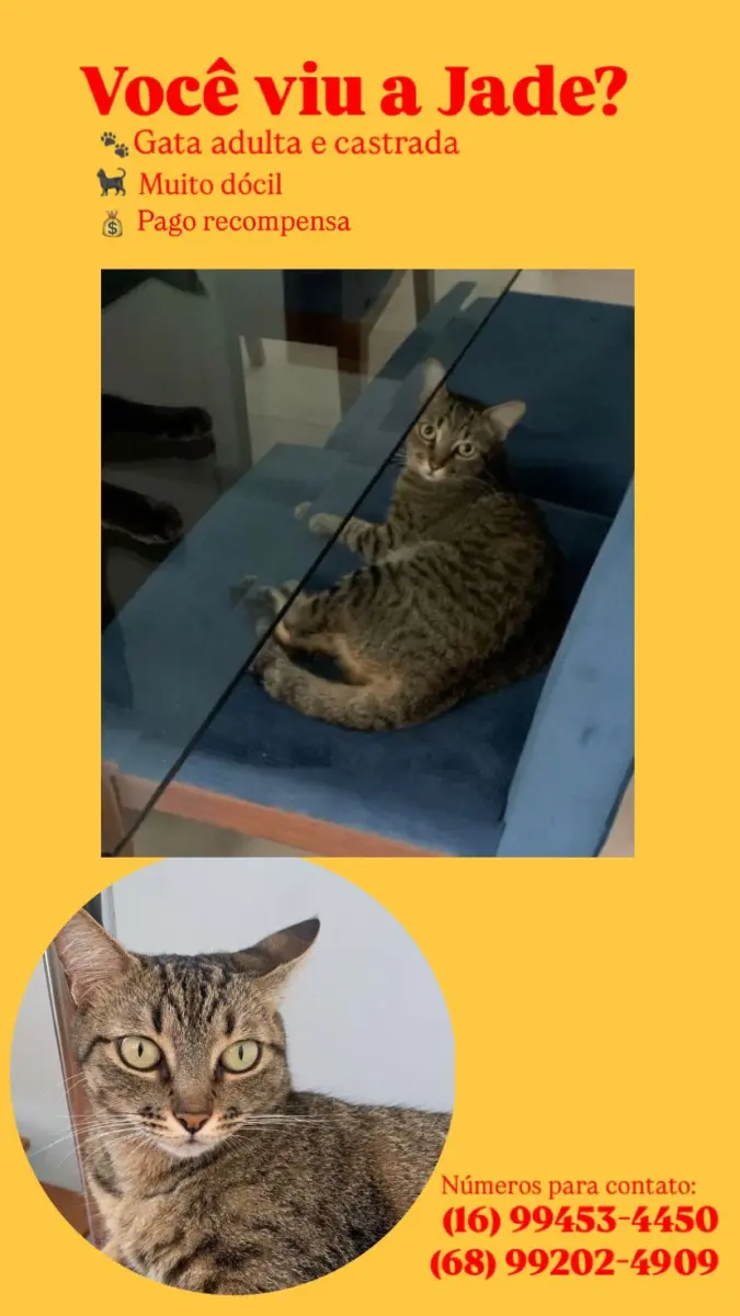 O pequena Jade, uma gatinha de pelagem rajada, está desaparecida desde o último domingo (22), na capital acreana. A felina morava em uma casa do Residencial Viena, localizado no Jardim Europa.