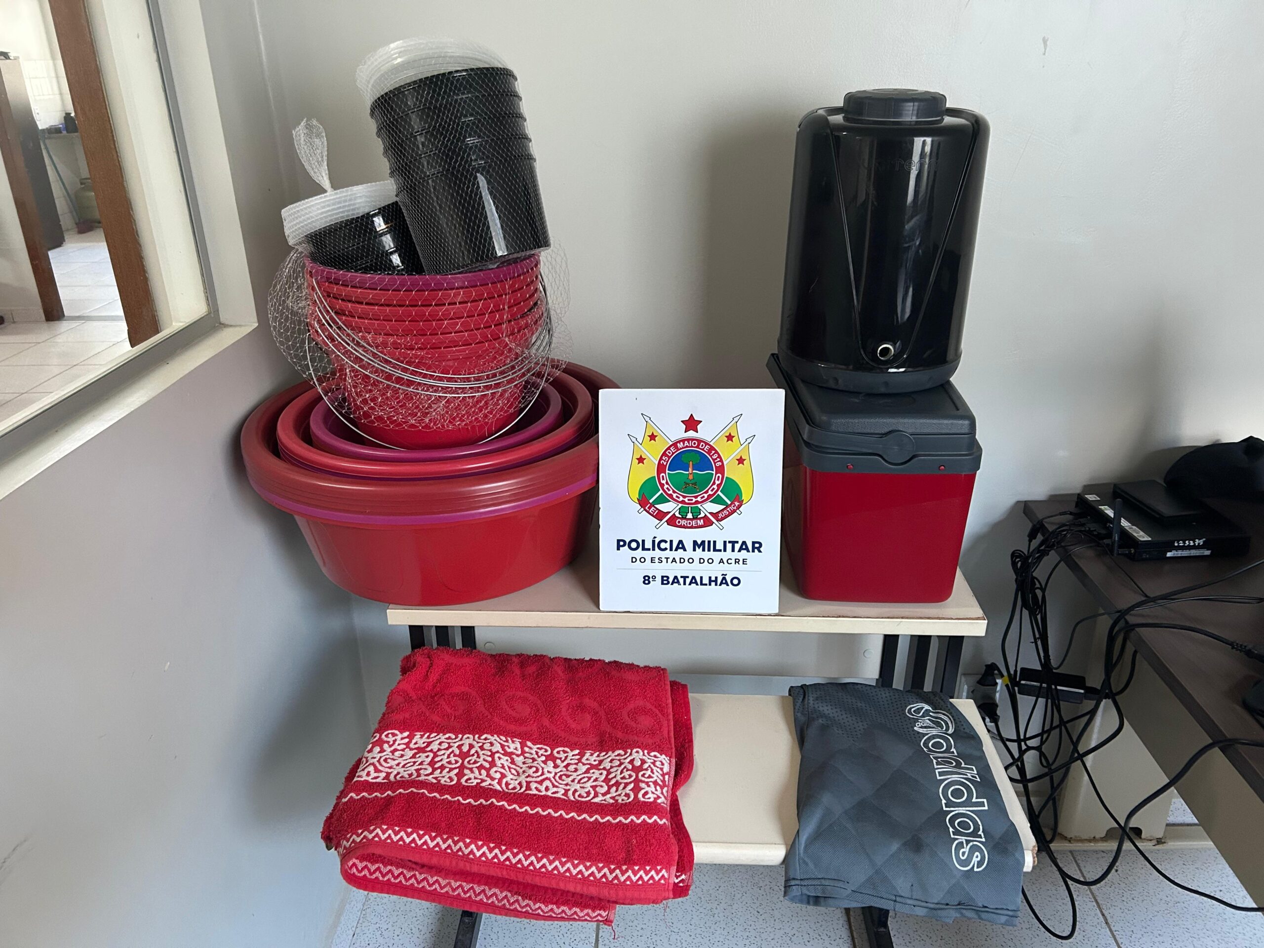 Em uma casa abandonada situada na rua Cunha Vasconcelos, os PMs encontraram: 18 bacias, 02 conjuntos de vasos, 06 baldes e garrafas térmicas. Os demais objetos, como por exemplo, os capacetes ainda estão sendo procurados.