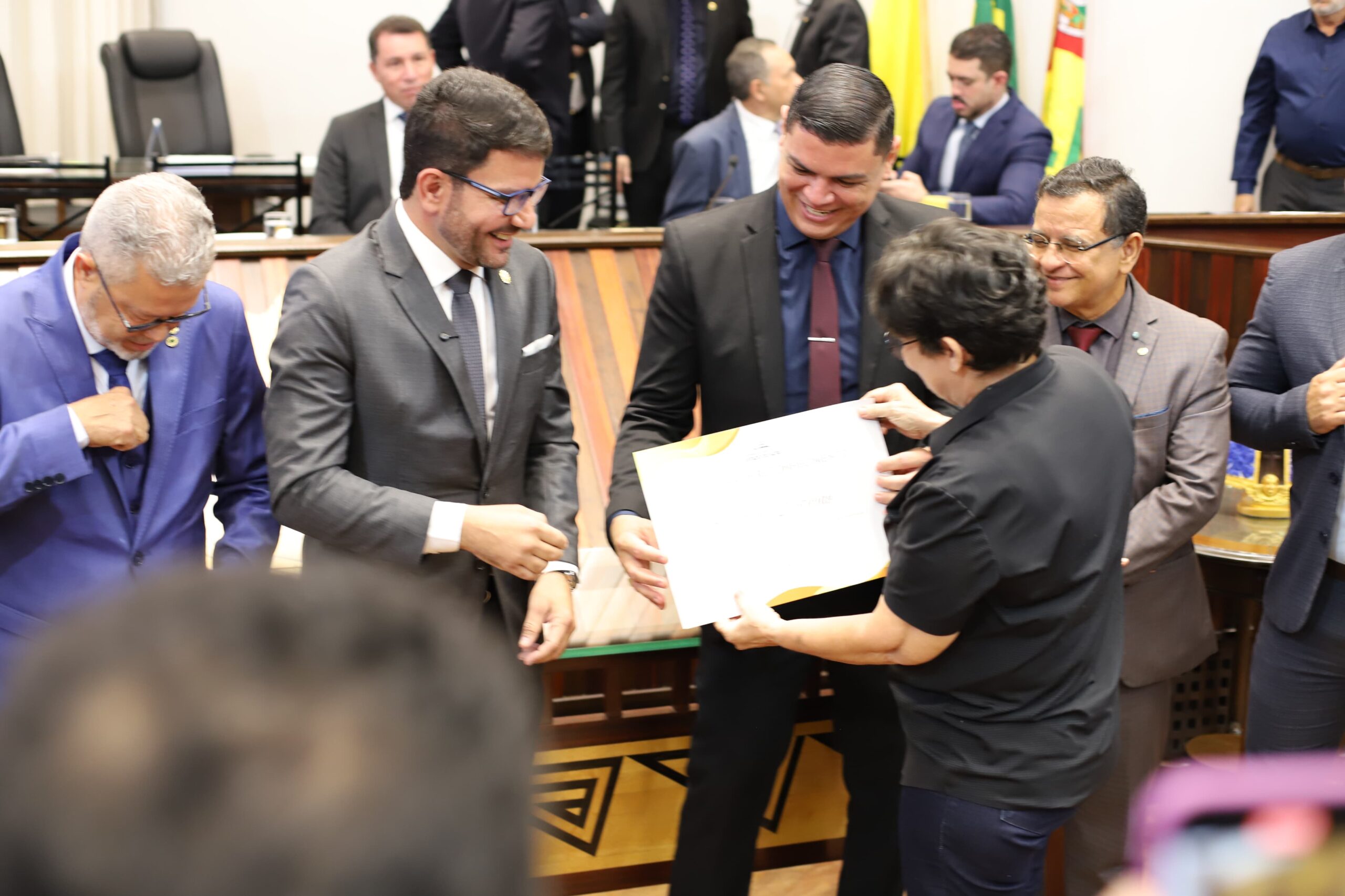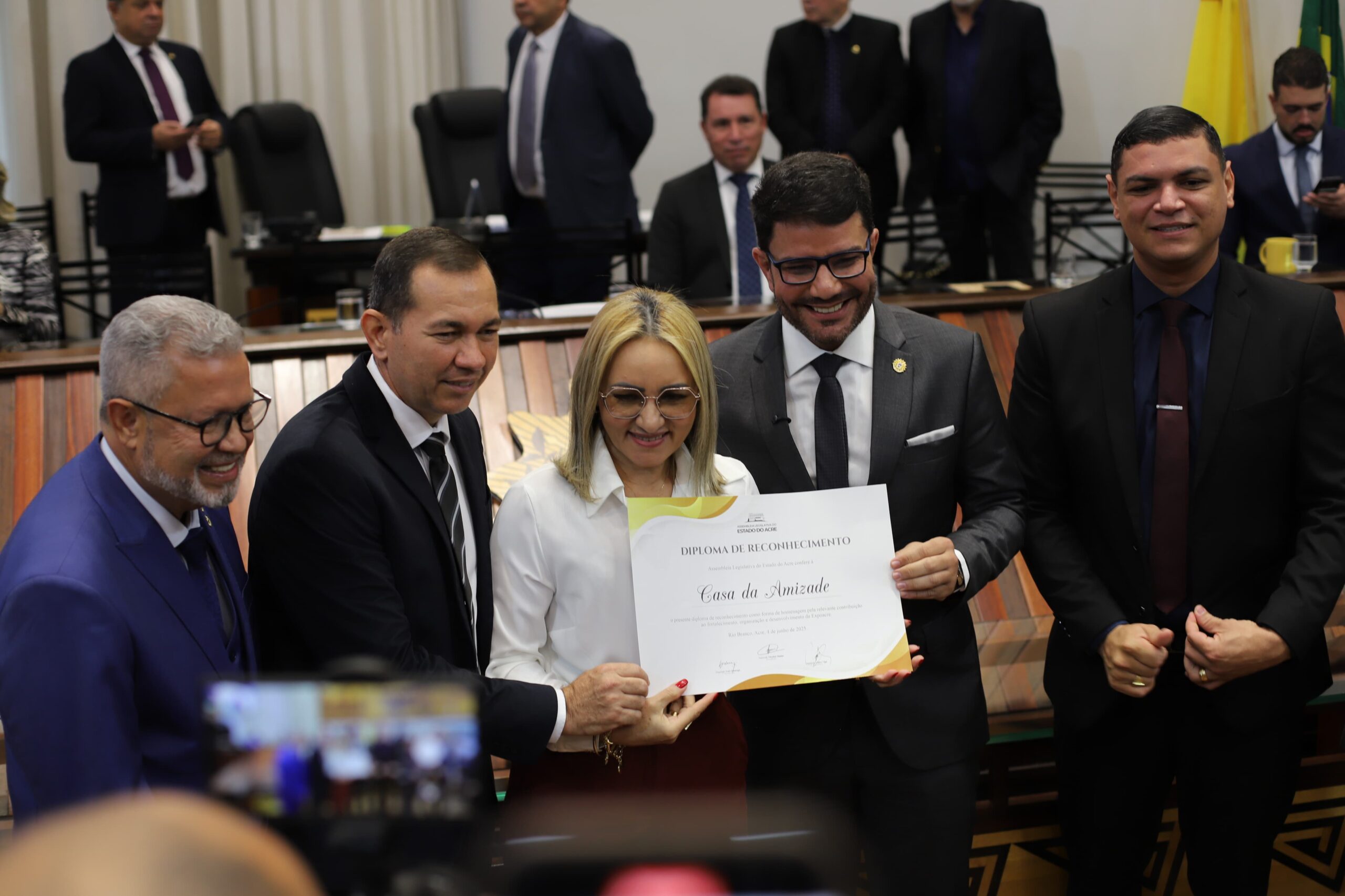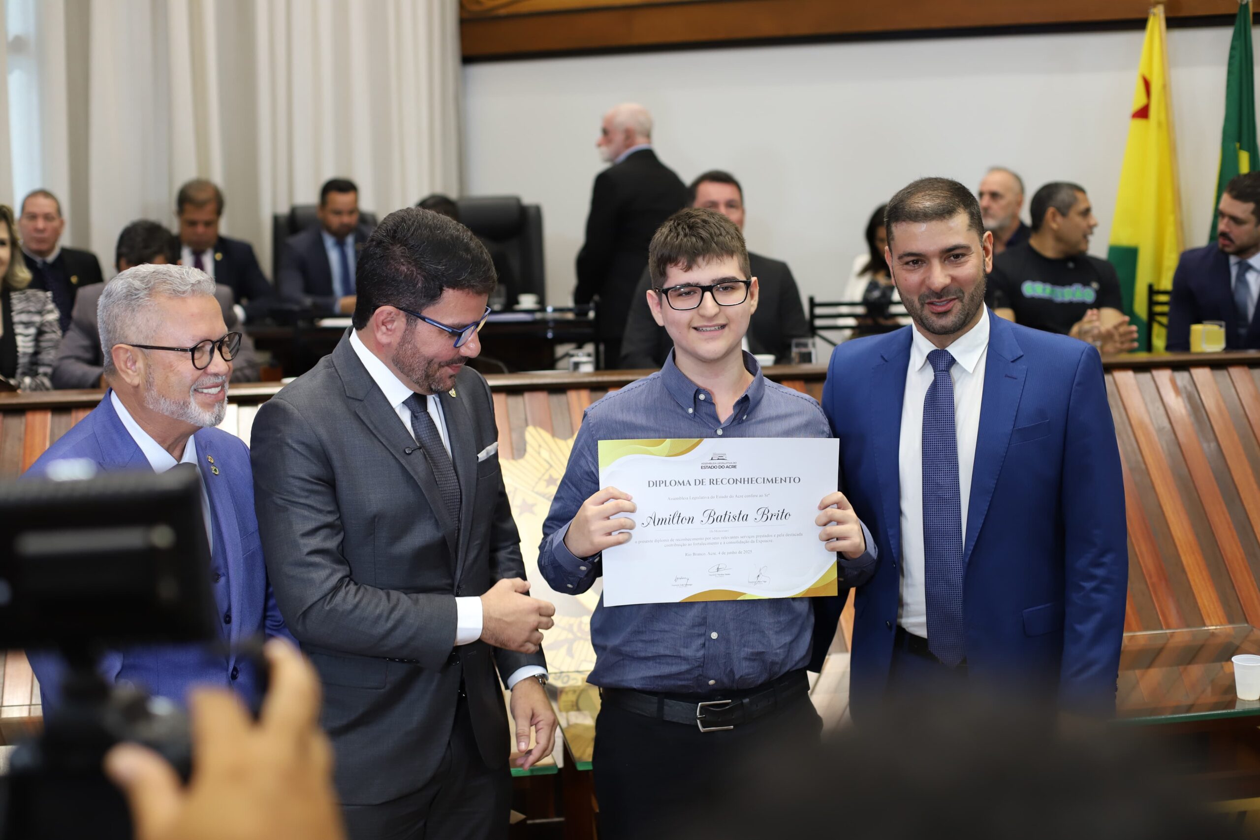 Ao todo, foram 70 homenageados. Os certificados foram entregues pelas mãos do governador Gladson Camelí, do presidente da Aleac, deputado Nicolau Júnior, do deputado Afonso Fernandes, autor do requerimento que sugeriu a sessão solene e do secretário da Casa Civil, Johnatan Donadoni, que coordena a organização da feira.