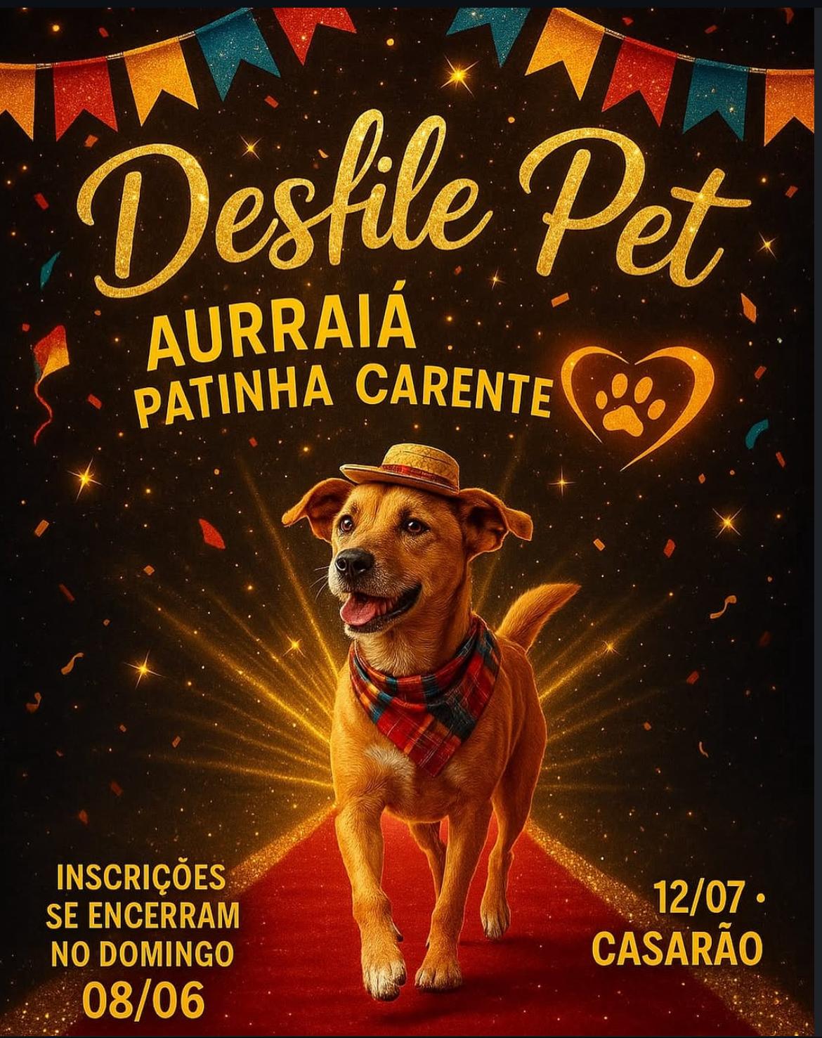 A Associação Patinha Carente prepara uma programação especial para os amantes de animais e festas típicas: o “Aurraiá Patinha Carente” será realizado no dia 12 de julho, no Casarão, e já conta com mais de 20 pets inscritos para um desfile que promete ser um verdadeiro espetáculo de fofura e alegria.