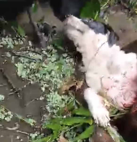 As pessoas que estavam no local golpearam a cobra conhecida popularmente como anaconda com golpes de terçado até conseguir salvar o cão que chorava desesperado.