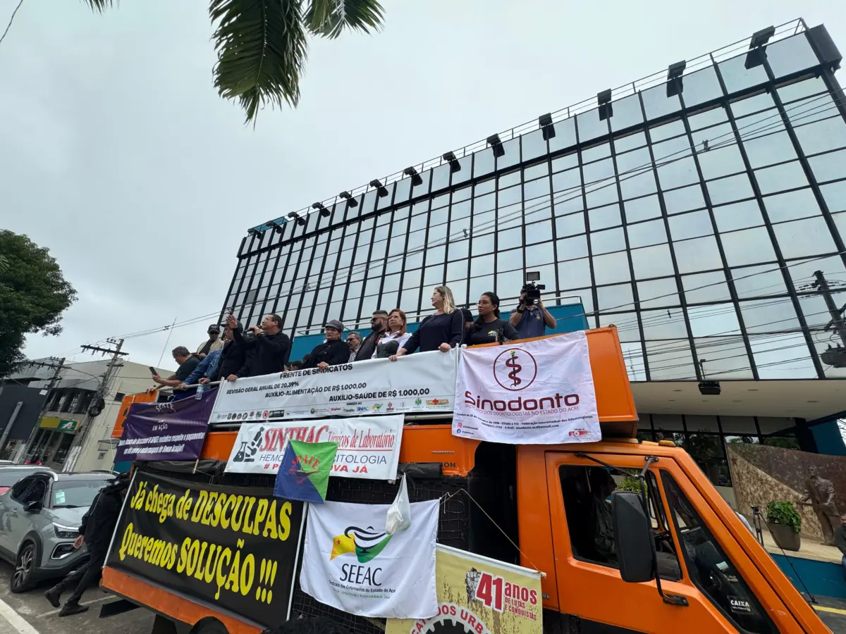 Os manifestantes exigem do governo do Estado a revisão geral anual de 20,39%, auxílio alimentação de R$ 1 mil e auxílio saúde no mesmo valor