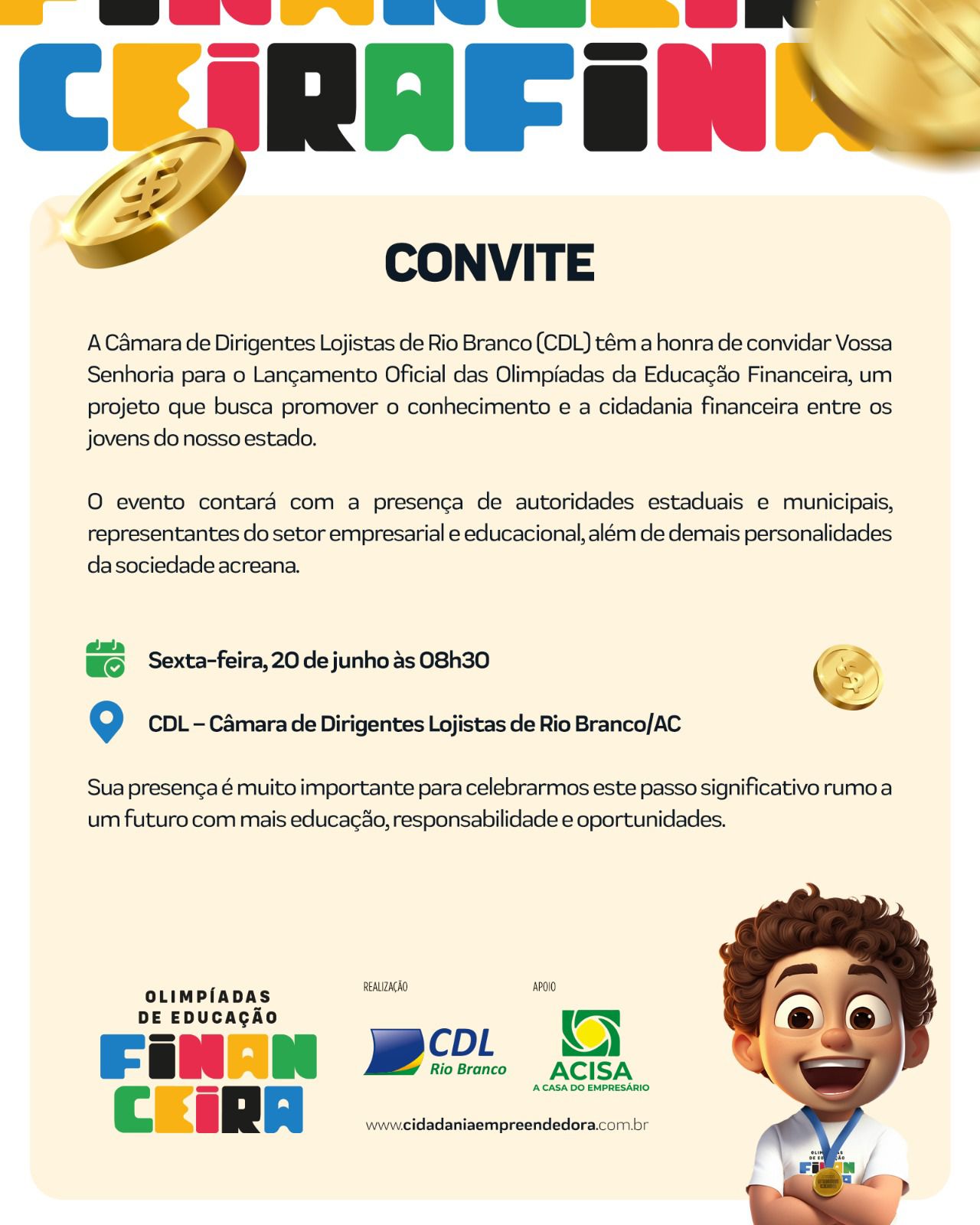 Com o objetivo de incentivar os jovens a se envolverem ativamente com a temática da gestão das finanças, oferecendo conteúdo para auxiliá-los no empoderamento financeiro, preparando-os para os desafios da vida adulta, com foco na redução e combate à cultura do endividamento, que atualmente atinge 80% da população brasileira, o movimento “Cidadania Empreendedora”, em parceria com a Câmara de Dirigentes Lojistas de Rio Branco – CDL, a Associação Comercial (Acisa), lança nesta sexta-feira, 20, a primeira edição das Olimpíadas Escolares de Educação Financeira”.