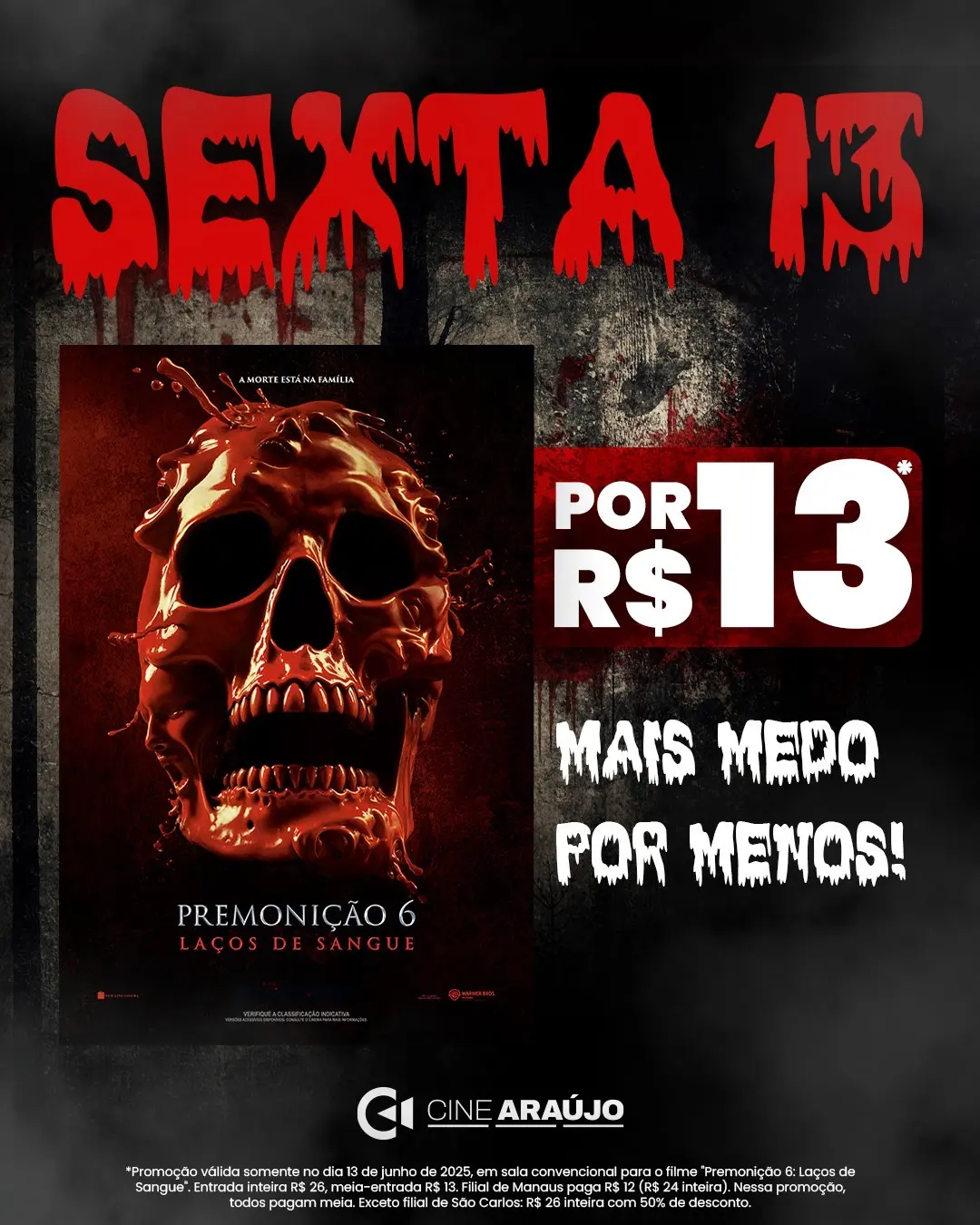 E se depois do clima romântico bateu aquela vontade de levar um susto, o Cine Araújo preparou uma surpresa de arrepiar para a sexta-feira 13. No dia 13 de junho, os ingressos para o filme “Premonição 6: Laços de Sangue” estarão com um preço de dar sorte: apenas R$ 13 na promoção (R$ 26 a inteira). Uma oportunidade perfeita para quem curte emoções fortes e não foge de uma boa trama sobrenatural.