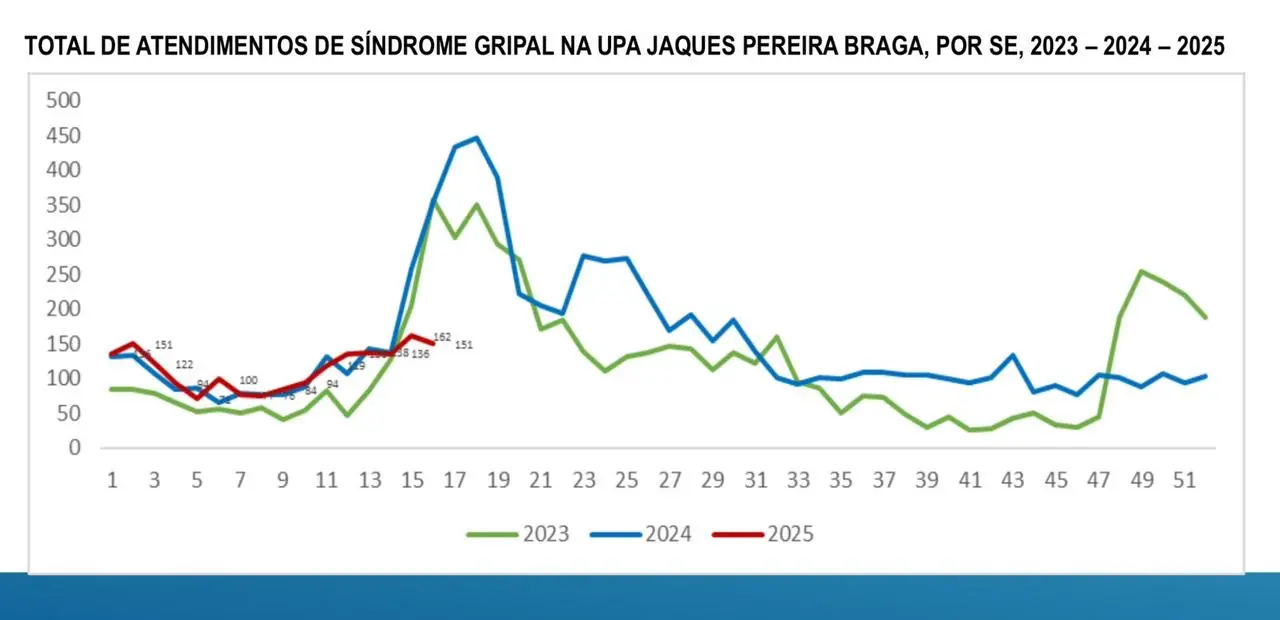 Os resultados desse trabalho aparecem claramente no gráfico de total de atendimentos por síndrome gripal, que compara os anos de 2023, 2024 e 2025. A linha vermelha, correspondente ao ano de 2025, demonstra que, mesmo nos períodos de maior risco, os atendimentos foram significativamente menores em relação aos anos anteriores. Em 2023, por exemplo, as semanas epidemiológicas entre a 15ª e a 20ª apresentaram picos superiores a 400 atendimentos semanais, enquanto em 2025 os números ficaram estáveis, sem a ocorrência dos mesmos picos.